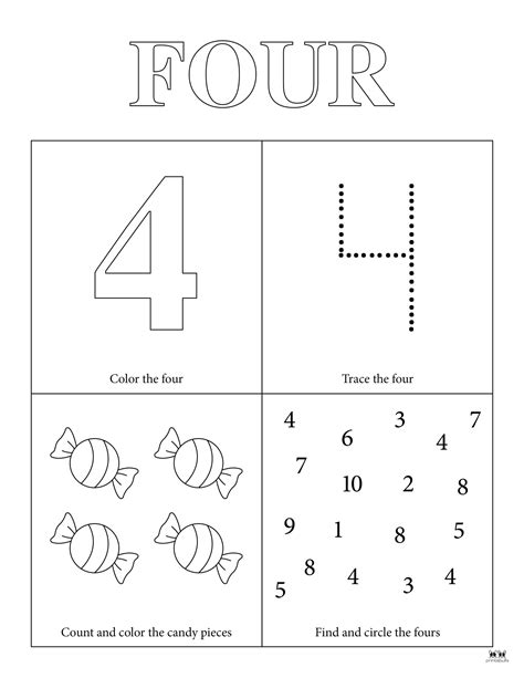 Use a marker or crayon to trace the 4’s and the word, “four”. If you want to keep it simple, just print the tracing printables. Web here are some fun and free number counting, writing and identification sheets to help your child learn numbers four 4.